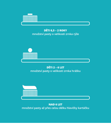 Od 12. měsíce se zuby čistí také 2× denně: po snídani a večer před spaním. Používej krouživé pohyby a malé množství zubní pasty, která je určena speciálně pro malé děti se sníženým obsahem fluoridu