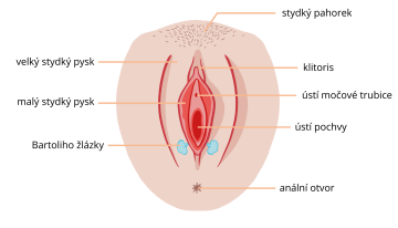 Jako vulva se nazývají vnější ženské pohlavní orgány. Chrání ji stydké pysky (velké a malé), vpředu najdeš klitoris a dále se skládá z poševní předsíně, kde je i močová trubice a vagína neboli pochva.