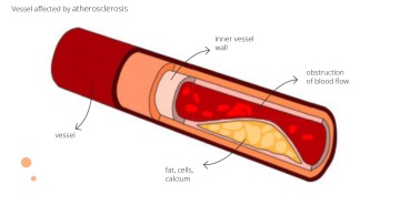 Also called hardening of the arteries is a process in which fat, other cells and calcium build up in the walls of blood vessels. It develops as chronic inflammation. It primarily affects large and medium blood vessels - heart vessels, aorta, common carotid artery, and brain arteries.